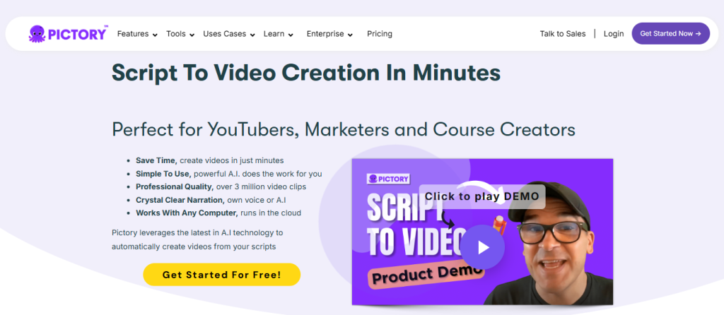 Pictory is another script-to-video generator tool. This tool has been immensely popular among creators and marketers. You can paste a script or article, and Pictory’s AI automatically breaks it into scenes and finds matching clips.