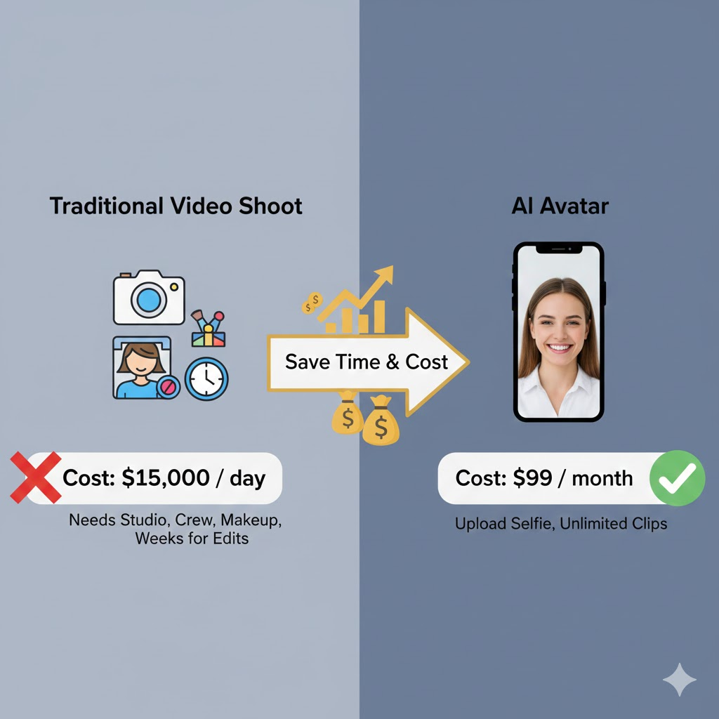 One photo replaces every future video shoot. No more booking studios, hiring crews, paying makeup artists, or waiting weeks for edits, and this is just the tip of the iceberg of benefits that you can enjoy when you convert a photo to an avatar. Brands drop a selfie into the tool and get unlimited talking-head clips for the price of one traditional production day. The math is brutal: a $15k human shoot becomes $99/month flat. That saved cash goes straight into ad spend, where it actually moves the needle.
