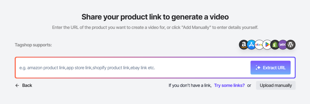 Step 2: Paste the URL. Drop that link into the AI reel generator, tools like Tagshop AI with URL to Video AI features are built for this. Once you hit paste, the tool goes to work. It automatically pulls all the important details, product name, images, and description. Edit or remove anything if you want.