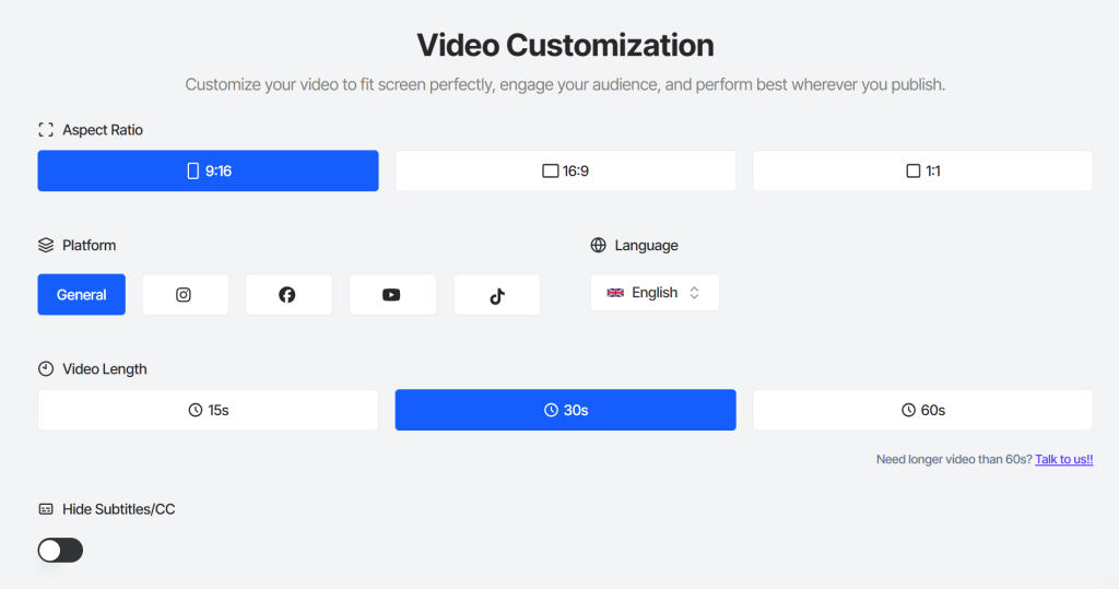 Step 3: Customize. You can choose the aspect ratio, platform, video length, and target audience.